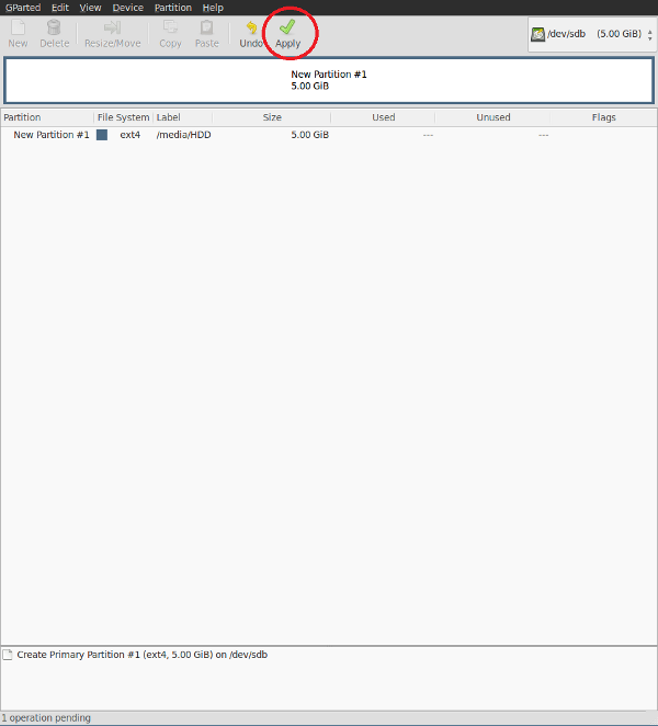 Wenn Sie es noch nicht getan haben, installieren Sie gparted (ein beliebtes Linux-Programm zur grafischen Formatierung von Festplatten und zur Bearbeitung von Partitionen). Öffnen Sie GParted und löschen Sie alle Partitionen auf der Festplatte, die Sie verschlüsseln möchten (stellen Sie sicher, dass sie vorher leer ist!). Erstellen Sie dann eine unformatierte Partition anstelle der soeben zerstörten.